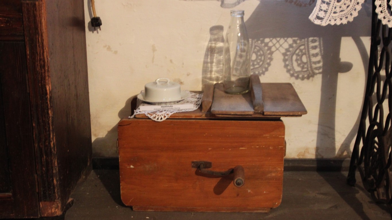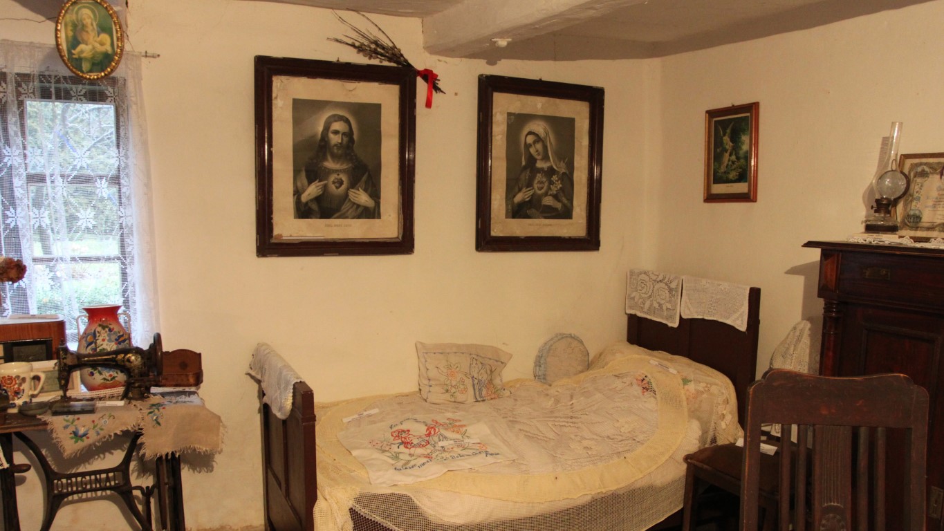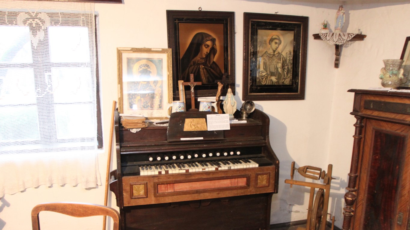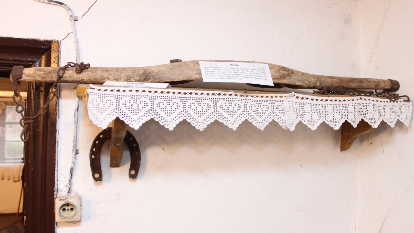 Dom zachował pierwotny układ wnętrza: z centralną sienią, z której w tylnej części wydzielono kuchnię oraz dwiema izbami, po jednej po każdej stronie. Wewnątrz zgromadzono sporo dawnych przedmiotów codziennego użytku, przekazywanych tutaj przez okolicznych mieszkańców. Posłuchajcie: