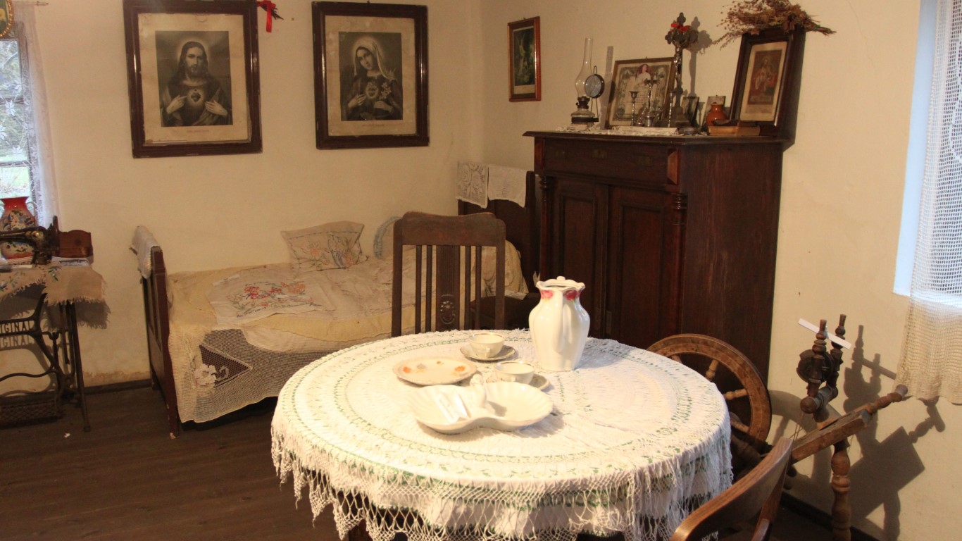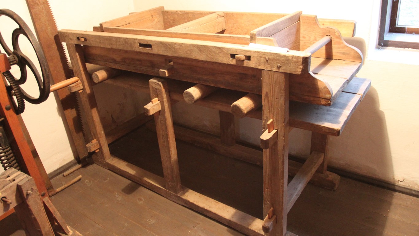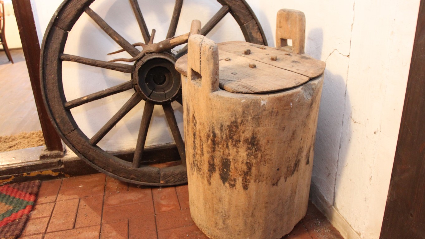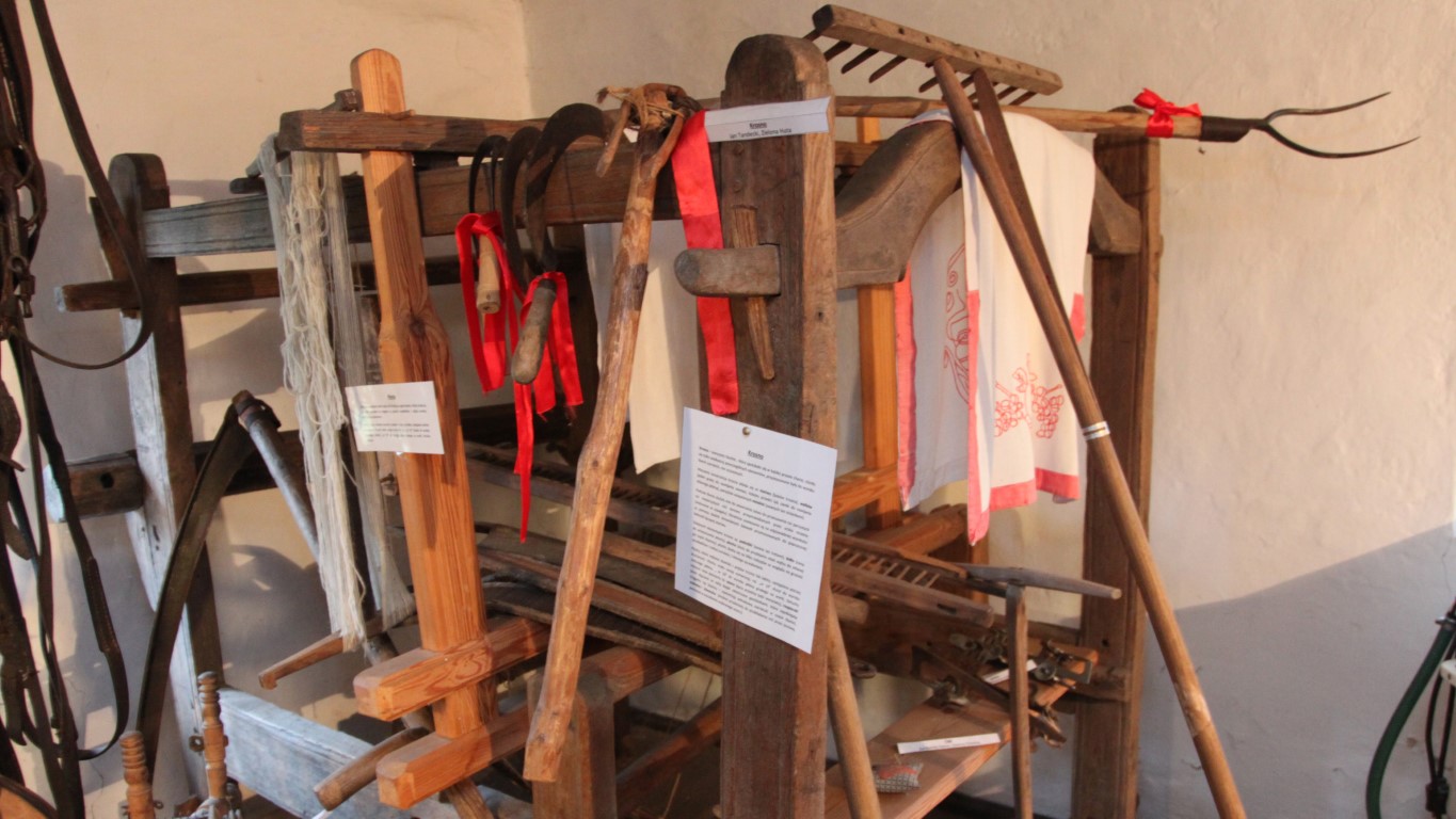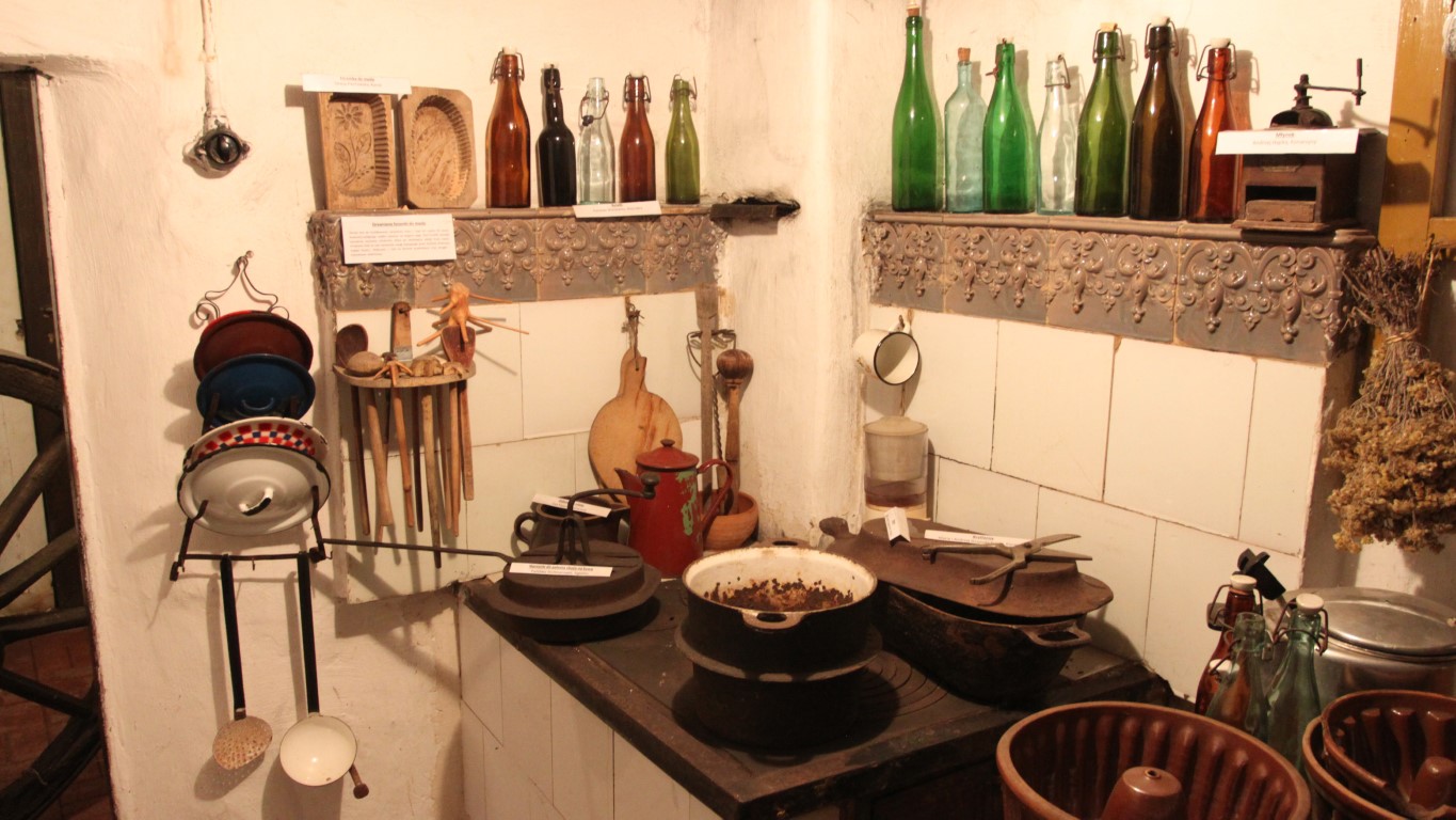 Dom zachował pierwotny układ wnętrza: z centralną sienią, z której w tylnej części wydzielono kuchnię oraz dwiema izbami, po jednej po każdej stronie. Wewnątrz zgromadzono sporo dawnych przedmiotów codziennego użytku, przekazywanych tutaj przez okolicznych mieszkańców. Posłuchajcie: