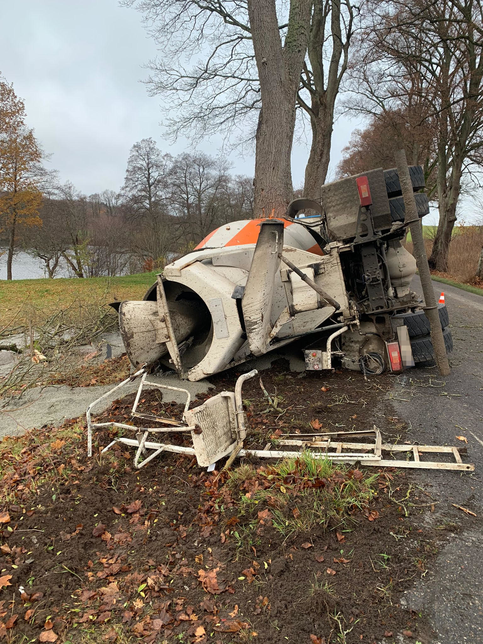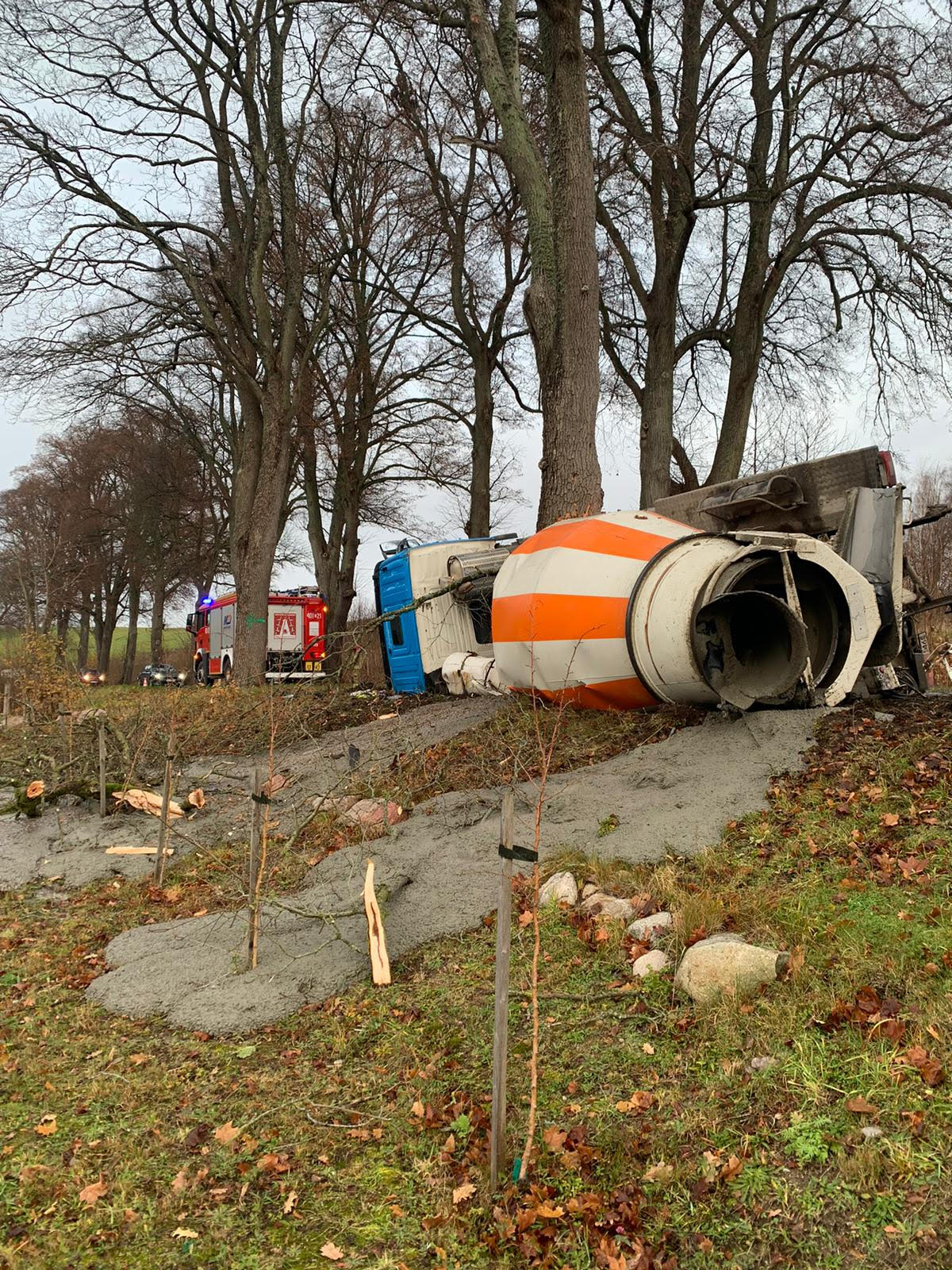 Zdarzenie drogowe z udziałem auta ciężarowego w Unichowie w gminie Czarna Dąbrówka. Dzisiaj (19.11) rano na drodze 210 betoniarka uderzyła w drzewo.