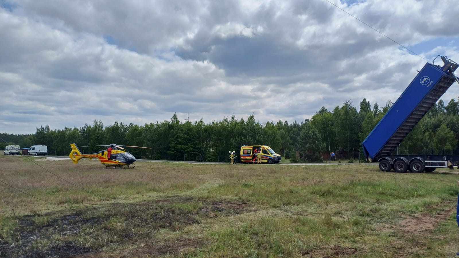 Kierowca tej ciężarówki podniósł tę wywrotkę do góry, zrywając linię średniego napięcia. Doszło do przebicia tego prądu do ziemi. Kierowca wychodząc z tego samochodu został porażony prądem. W wyniku tego porażenia prądem doznał poparzeń. Na miejscu lądował śmigłowiec Lotniczego Pogotowia Ratunkowego. Tego pana przytomnego przetransportowano do szpitala w Bydgoszczy. Działania strażaków polegały na zabezpieczeniu miejsca zdarzenia, utworzeniu takiej strefy bezpiecznej.