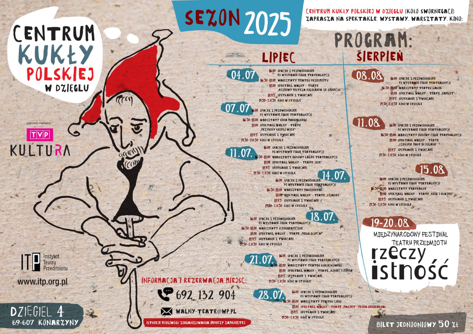 Stałymi punktami każdego spotkania będzie spacer z przewodnikiem po wystawie figur teatralnych, spotkanie z twórcami oraz kino w stodole. Nie zabraknie też Spektaklu Walnego o różnej tematyce – dziś (4.07.) będzie to teatr "Rozmowy mistrza Polikarpa ze śmiercią" oraz warsztatów, np. teatru przedmiotu, kina manualnego czy tworzenia marionetek.