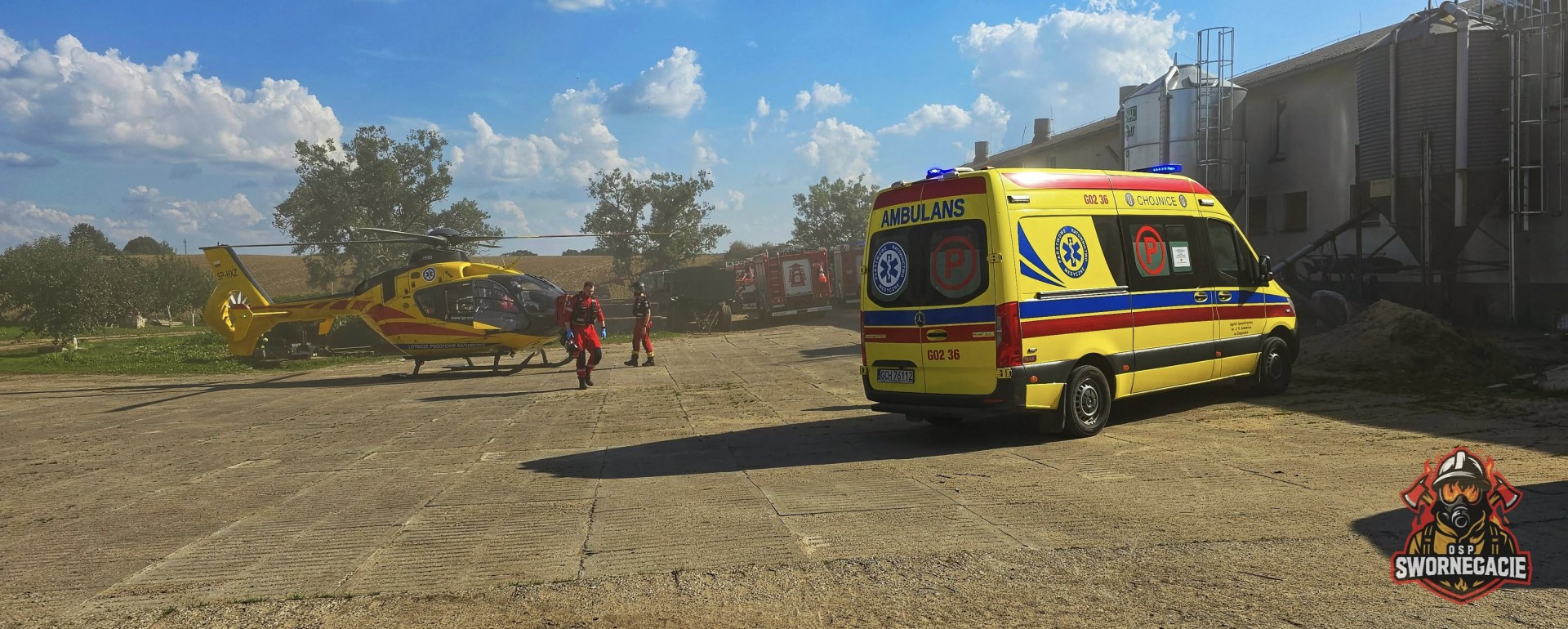 Osoba wpadła do zbiornika na gnojówke. Zespół Ratownictwa Medycznego był przed jednostkami ochrony przeciwpożarowej. 3 osoby poszkodowane, 2 osoby nieprzytomne, jedna przytomna. Nasze działania zabezpieczenie oczywiście miejsca zdarzenia, pomoc ZRM, detektorem wielogazowym sprawdzono to miejsce, ten zbiornik. Podchodzi też Lotnicze Pogotowie Ratunkowe do lądowania. Na miejscu wykryto też w zbiorniku siarkowodór.