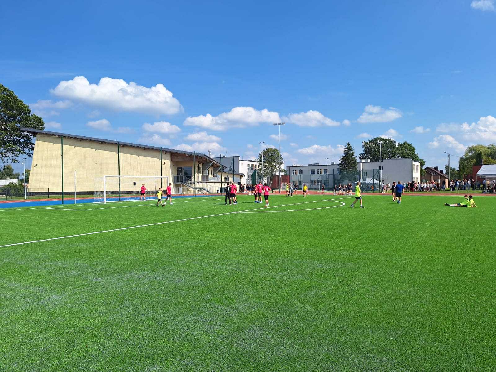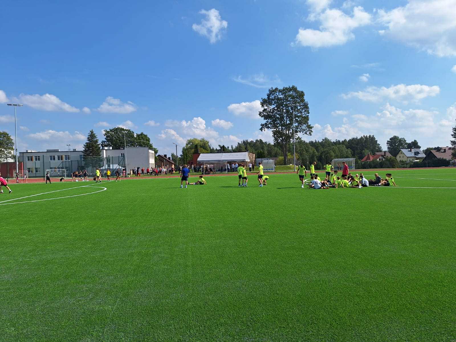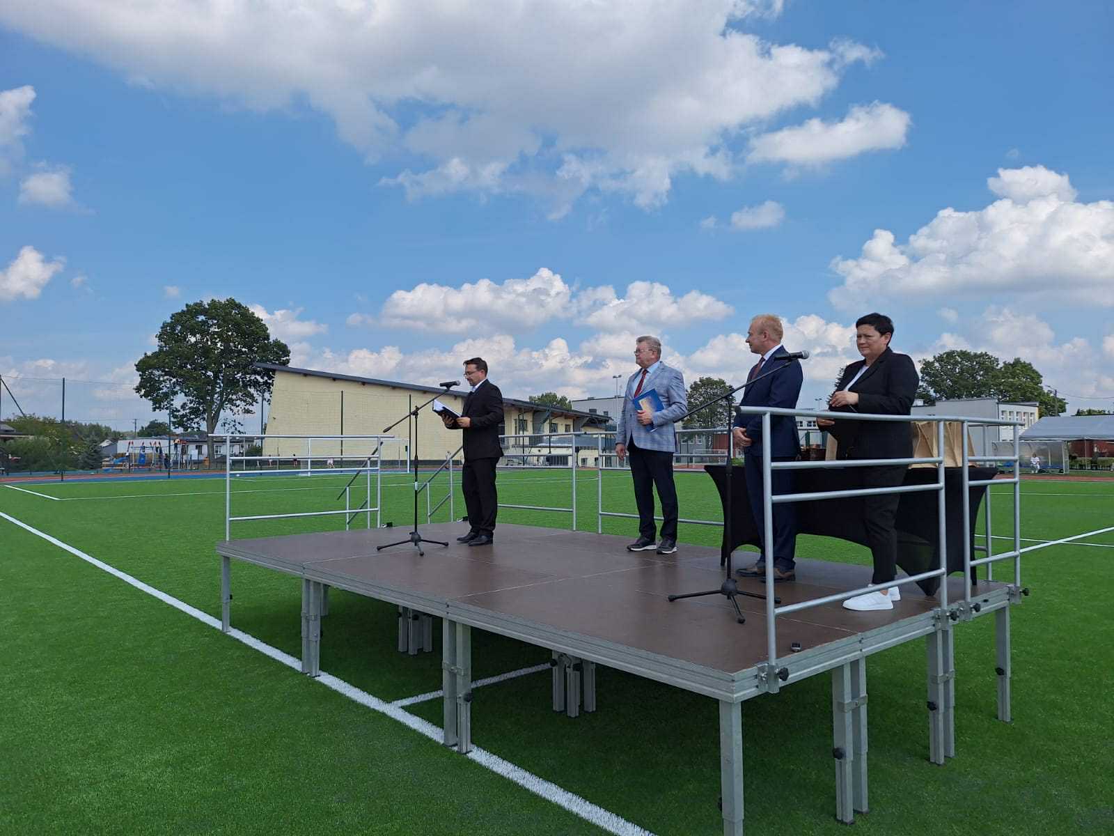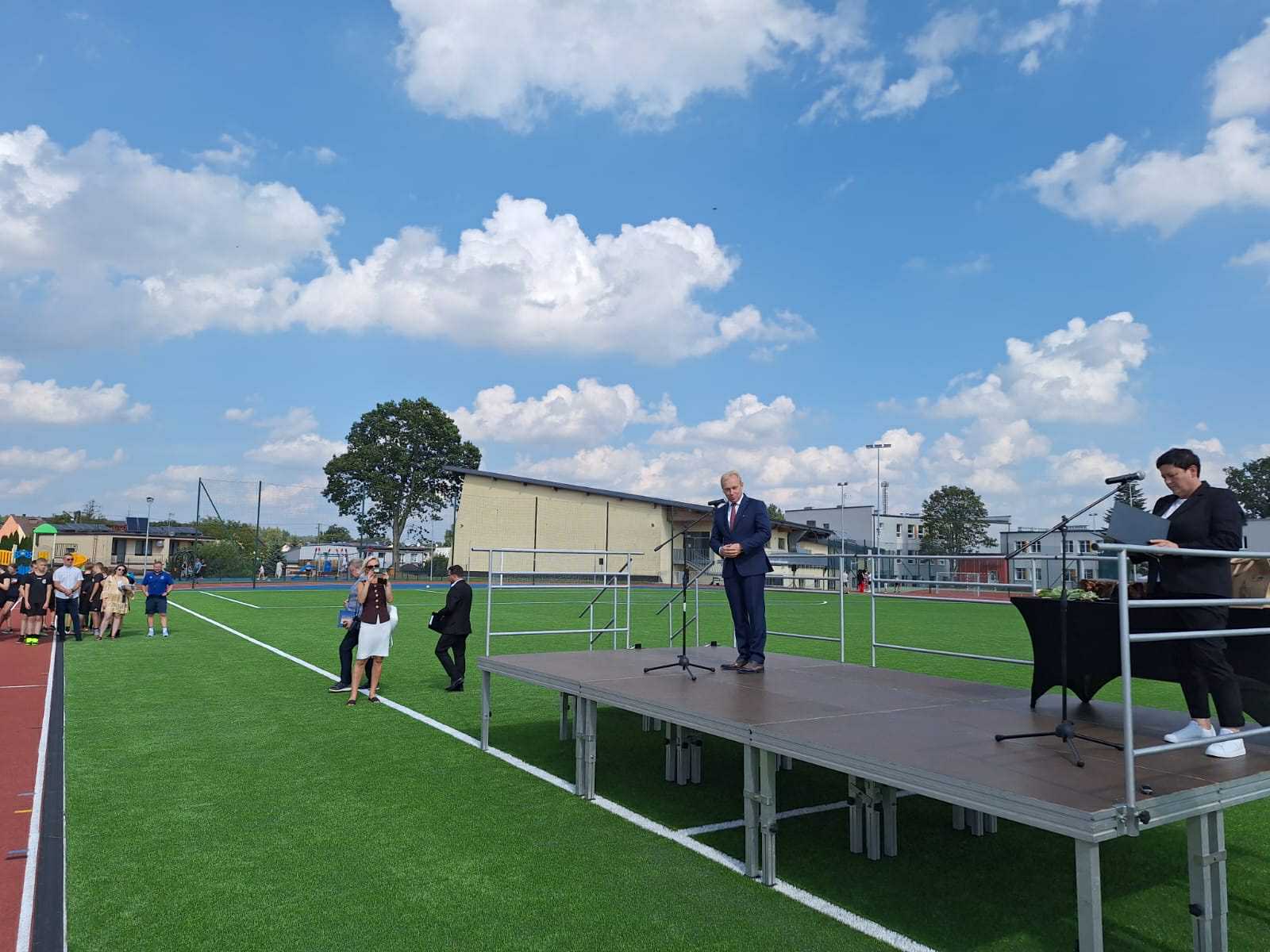 - Powstał kompleks złożony z boiska wielofunkcyjnego, jest to boisko do piłki nożnej o nawierzchni z trawy syntetycznej 45 na 90, czyli takie, które już nam pozwoli na to, żeby również nasze drużyny piłkarskie seniorskie mogły na nim prowadzić rozgrywki. Dodatkowo jest bieżnia lekkoatletyczna 300 m również o nawierzchni syntetycznej, całość terenu zagospodarowana, z trybunami.
