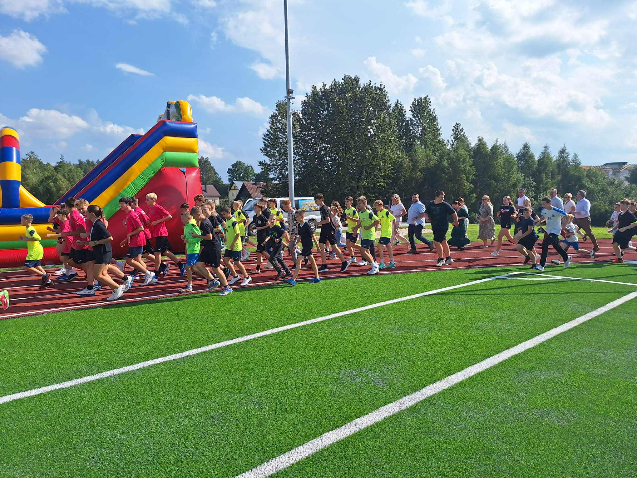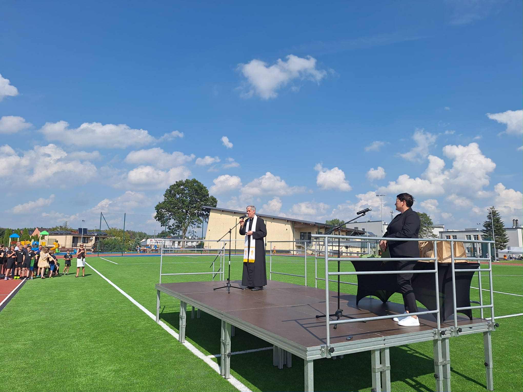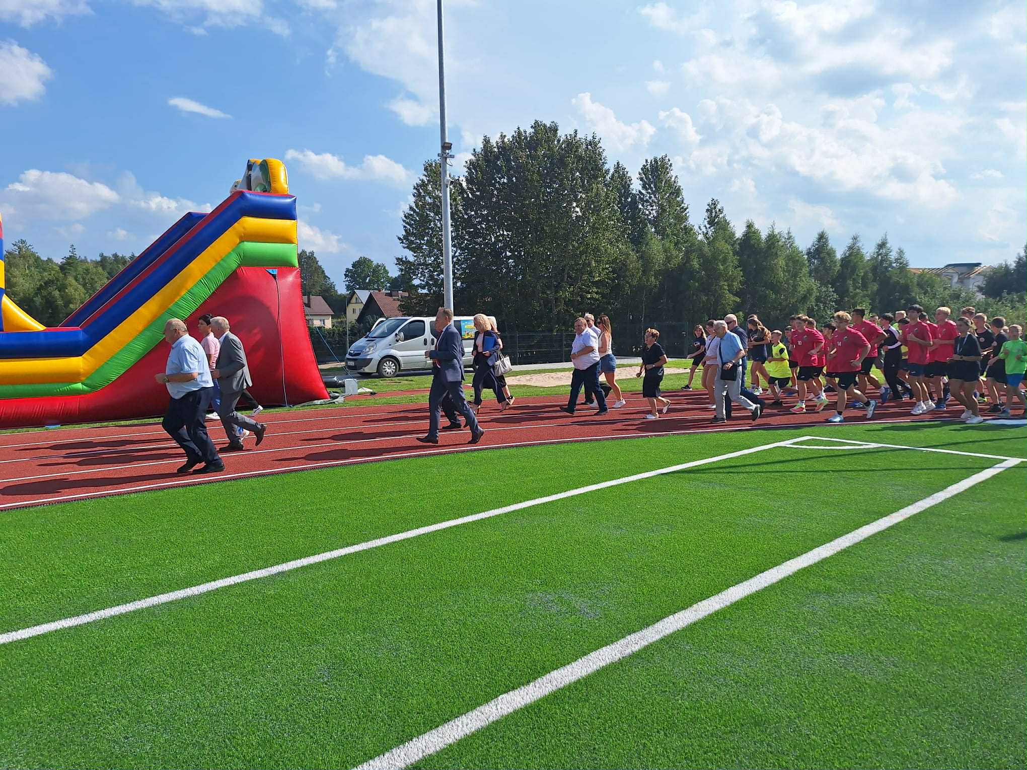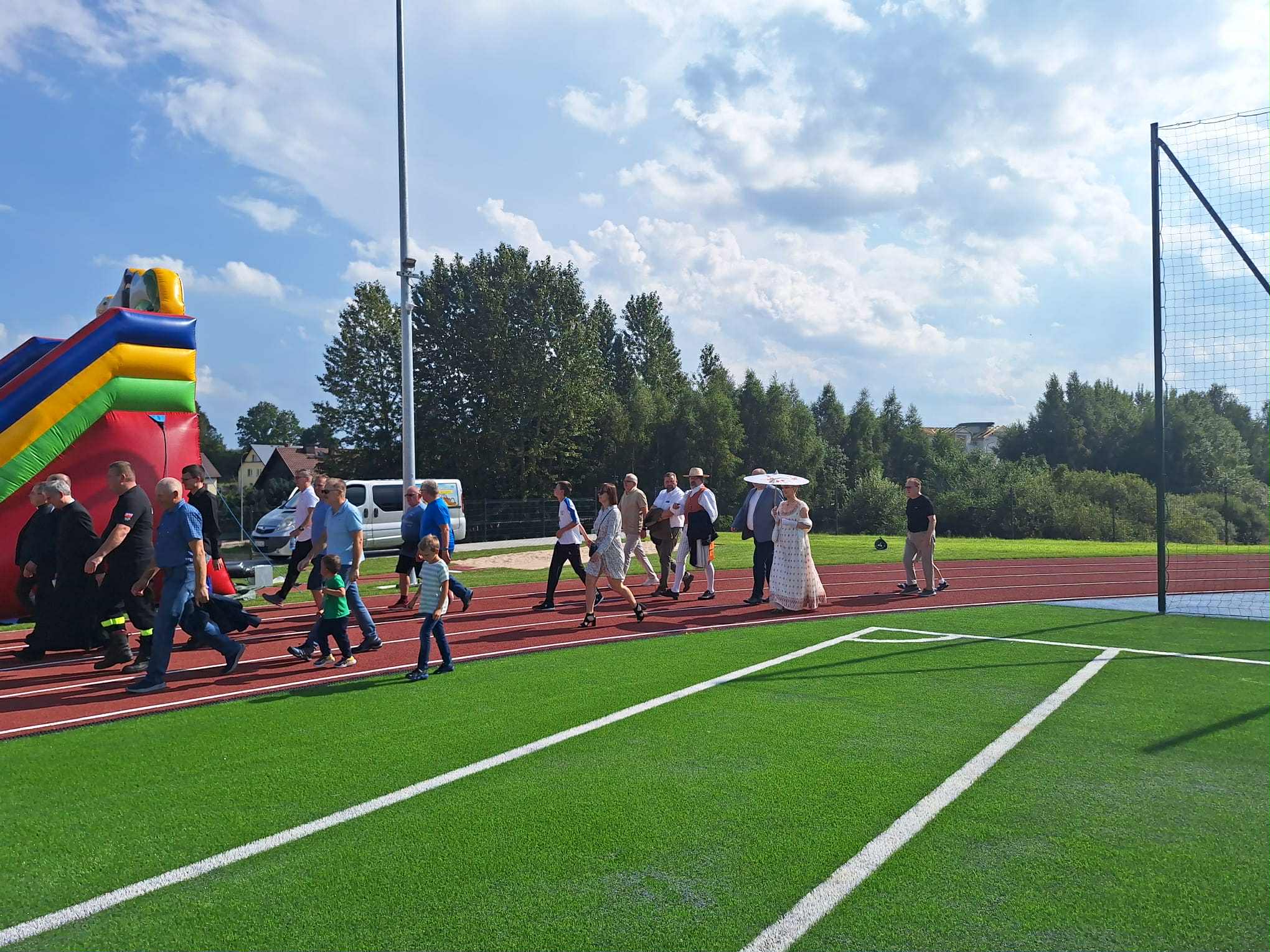 - Powstał kompleks złożony z boiska wielofunkcyjnego, jest to boisko do piłki nożnej o nawierzchni z trawy syntetycznej 45 na 90, czyli takie, które już nam pozwoli na to, żeby również nasze drużyny piłkarskie seniorskie mogły na nim prowadzić rozgrywki. Dodatkowo jest bieżnia lekkoatletyczna 300 m również o nawierzchni syntetycznej, całość terenu zagospodarowana, z trybunami.