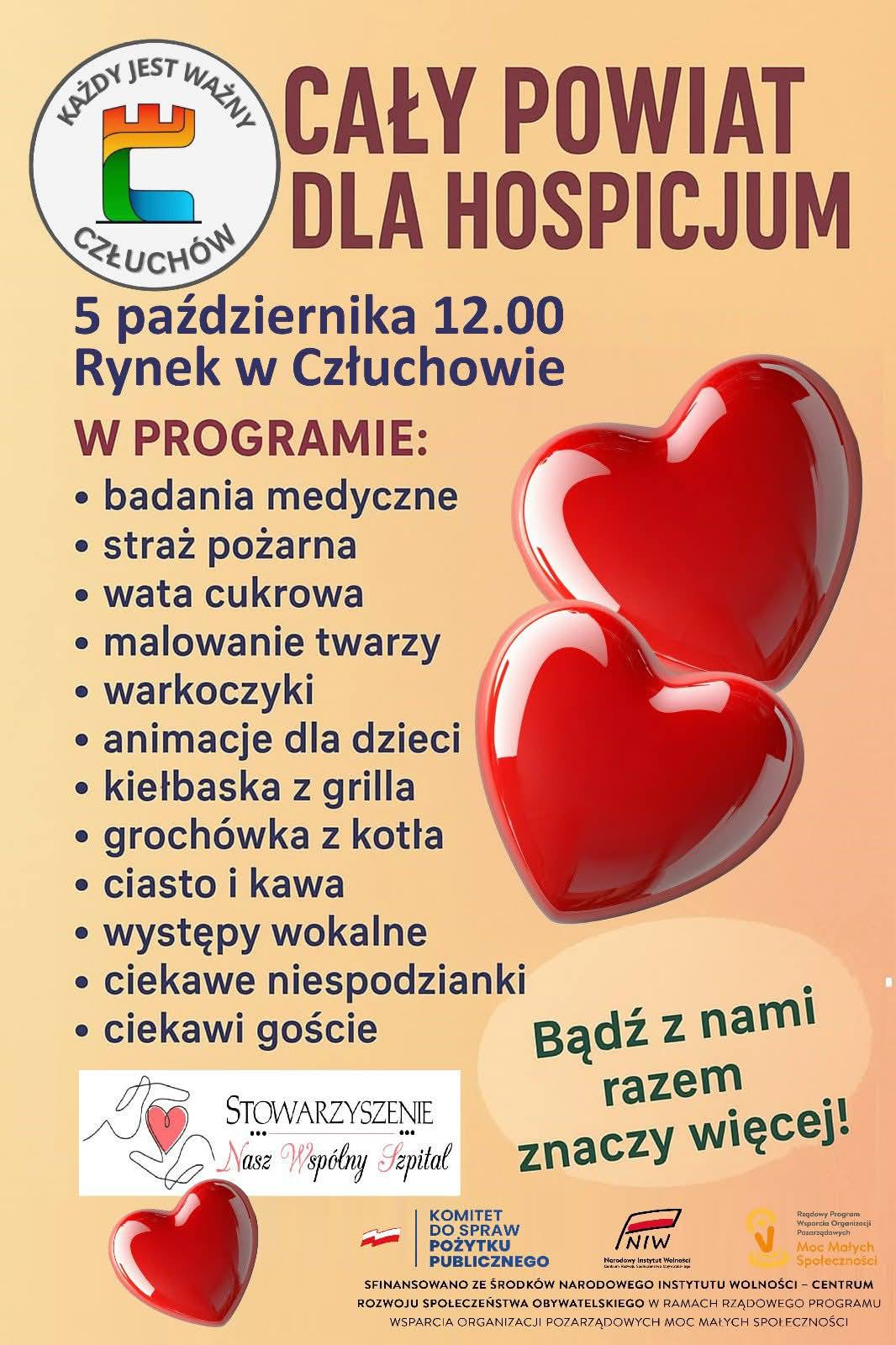 "Jesteśmy z państwem już po raz trzeci i po raz trzeci jesteśmy organizatorem we współpracy z zakładem Opieki Zdrowotnej w Człuchowie oraz Stowarzyszeniem NASZ WSPÓLNY SZPITAL imprezy i wydarzenia Cały Człuchów na Hospicjum. W tym roku połączyliśmy siły i nie jest to już "Cały Człuchów" ale CAŁY POWIAT DLA HOSPICJUM a to wszystko za sprawą realizowanego przez nasze stowarzyszenie projektu rządowego Międzypokoleniowy Wolontariat Spontaniczny w ramach programu Moc Małych Społeczności. Zaprosiliśmy do współpracy gminy Debrzno i gminę Czarne, oraz wszystkie Człuchowskie parafie a także parafie z Rychnów i Chrząstowa jak również parafię greckokatolicką"- mówiła w Weekend FM Elżbieta Józefowska, prezes stowarzyszenia "Człuchów Jest Ważny".