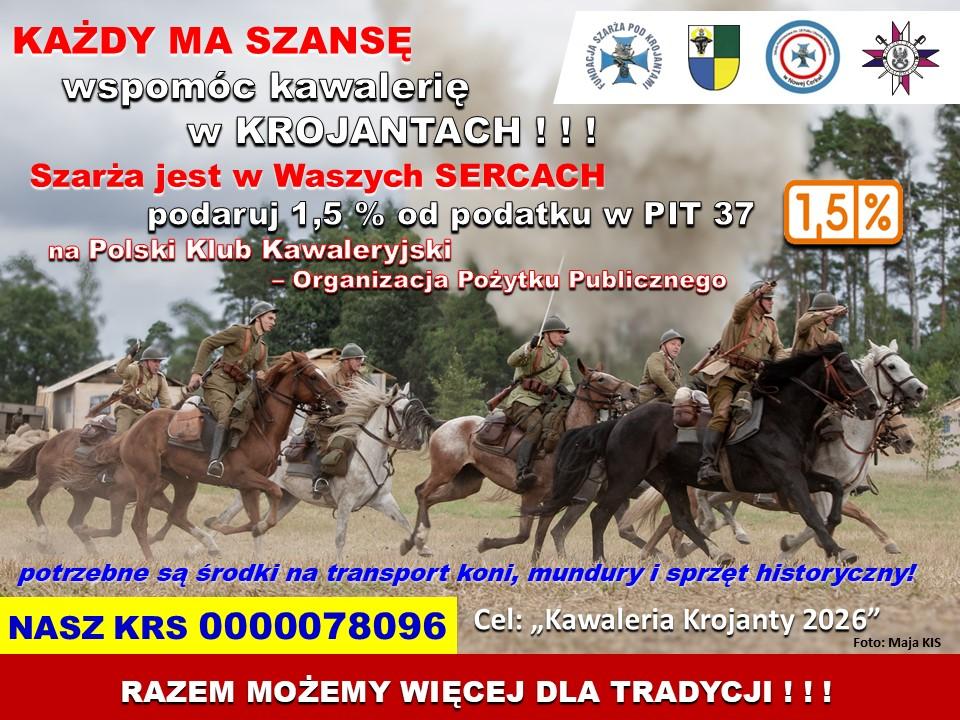 1. Odlicz od podatku 1,5 % w zeznaniu PIT za 2025 rok. Nr KRS: 0000078096, z adnotacją "Szarża pod Krojantami".