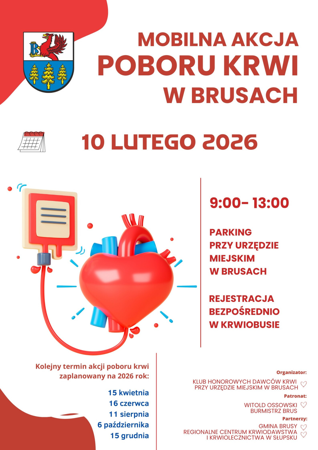 Honorowi Dawcy Krwi z gminy Brusy chętnie odwiedzali dzisiaj (10.02) plac przed bruskim urzędem. Stanął tutaj krwiobus w ramach pierwszej w tym roku mobilnej zbiórki krwi. Akcji patronował burmistrz Witold Ossowski, a chętnych nie brakowało.