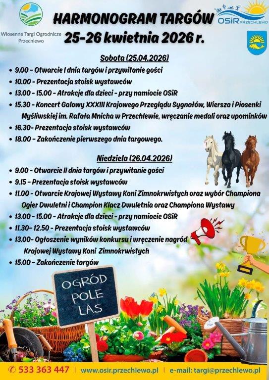 W sobotę (25.04) impreza trwać będzie od 9.00 do 18.00. W niedzielę (26.04) od 9.00 do 15.00. Samo wejście na teren targów jest bezpłatne. Zapłacić trzeba natomiast za parking - w tym roku 15 zł. Od strony Sąpolna jest około 1 tys. 200 miejsc postojowych, natomiast od strony Konarzyn około 400.