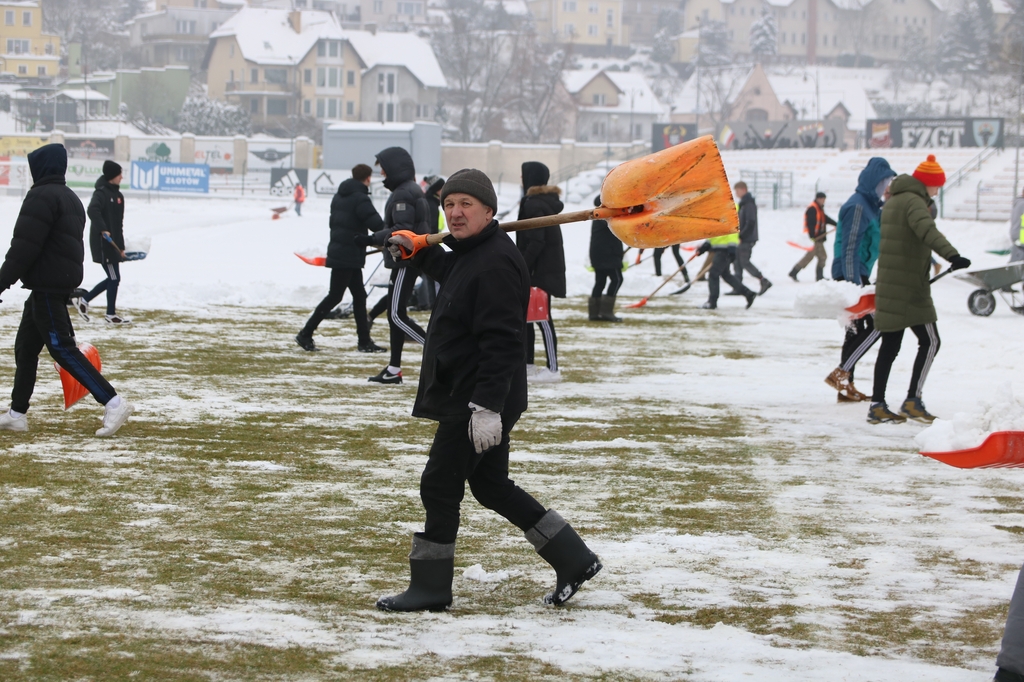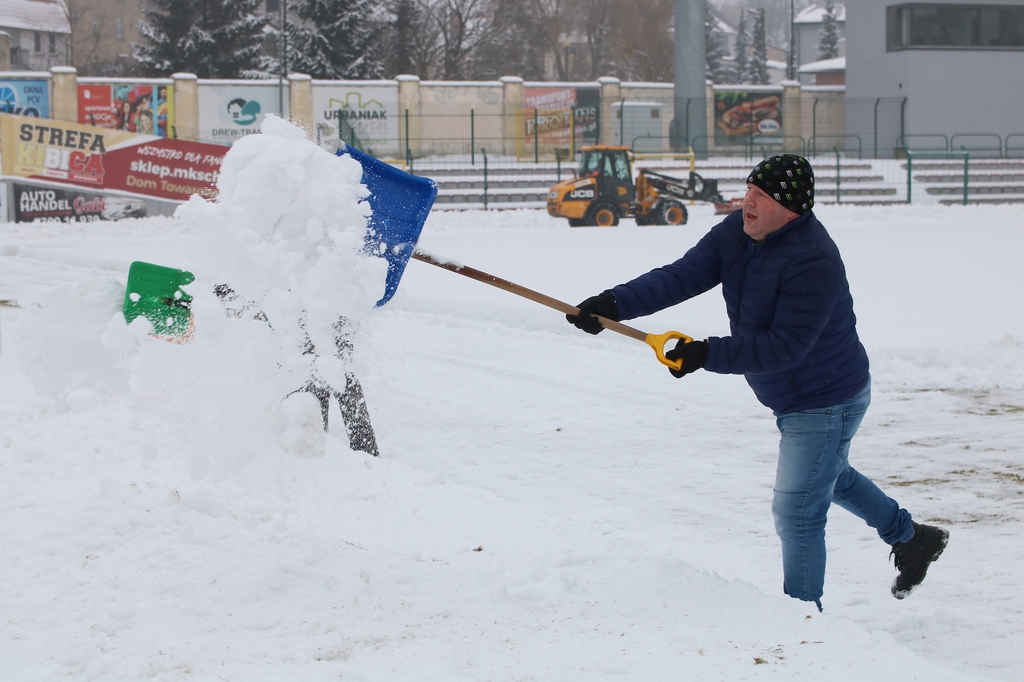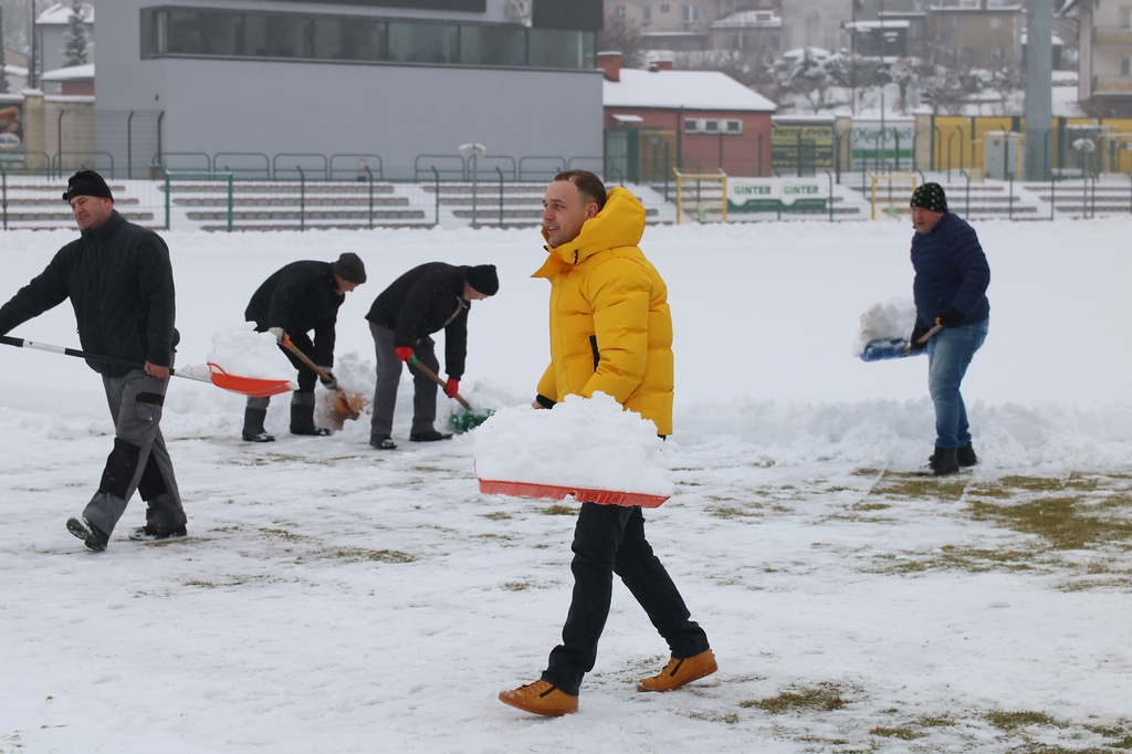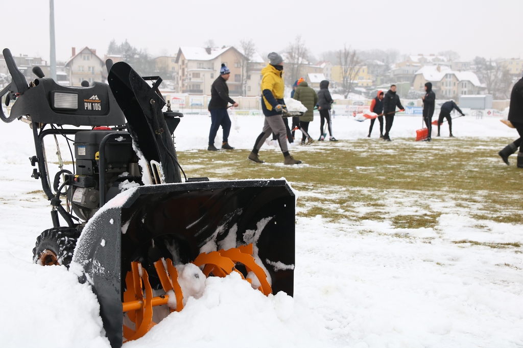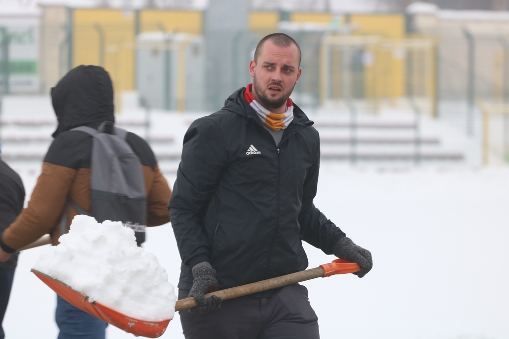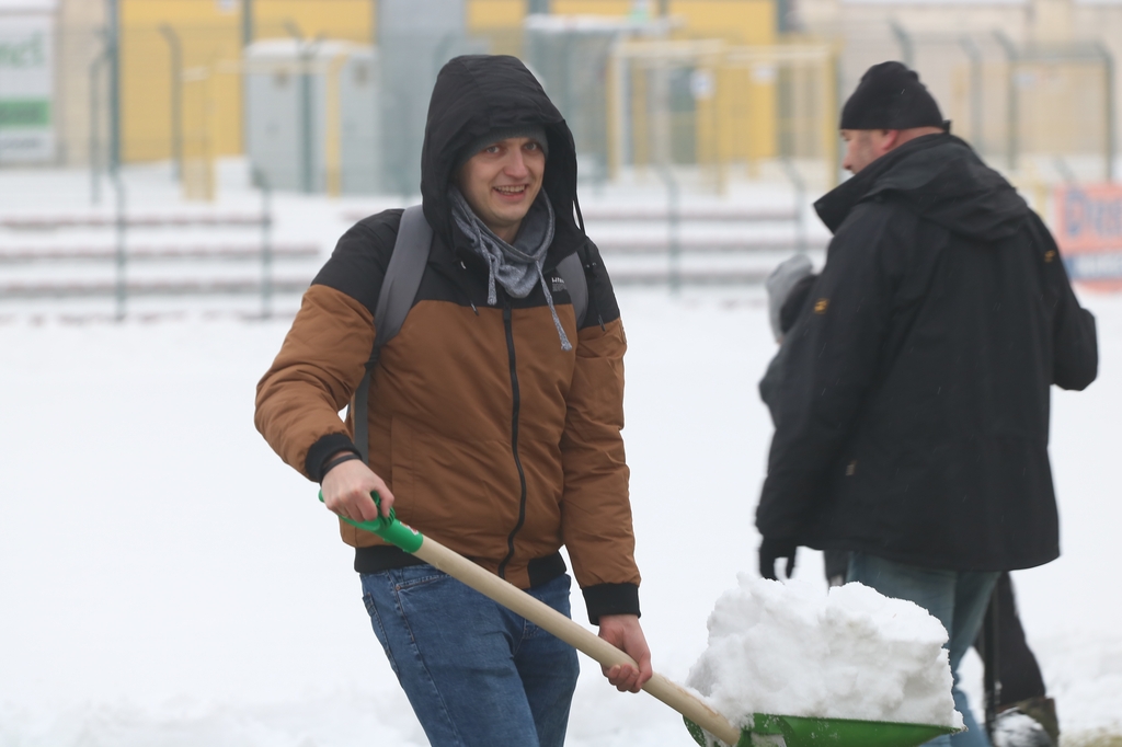 "Odśnieżamy na Cracovię". Prawie 100 osób usuwa śnieg z boiska na stadionie Chojniczanki (FOTO, WIDEO, ROZMOWA)