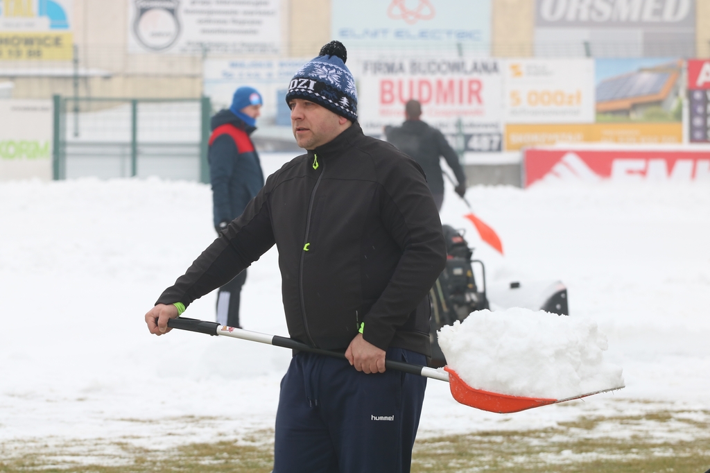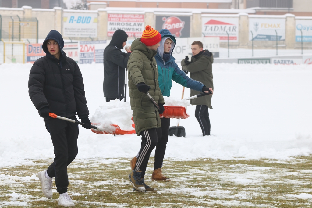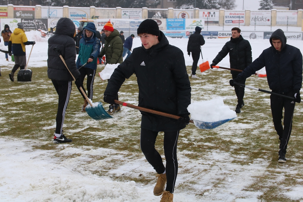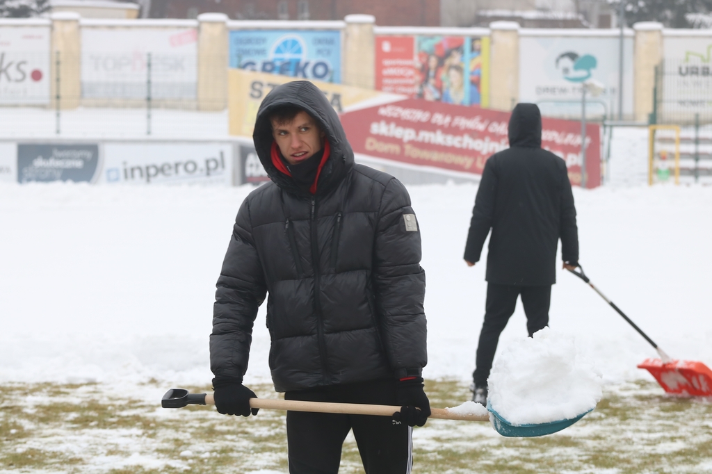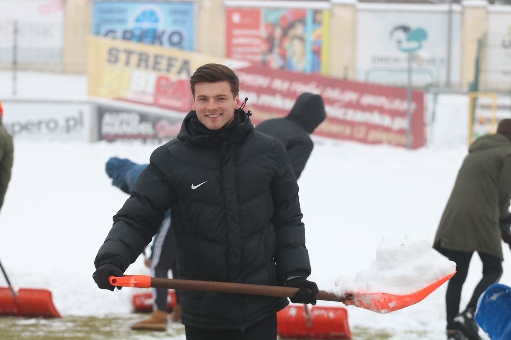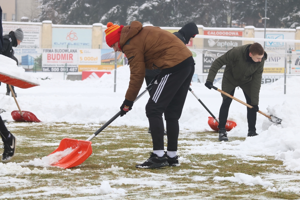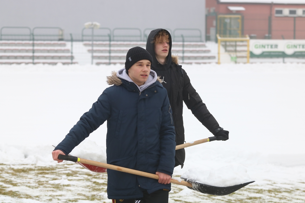 "Odśnieżamy na Cracovię". Prawie 100 osób usuwa śnieg z boiska na stadionie Chojniczanki (FOTO, WIDEO, ROZMOWA)