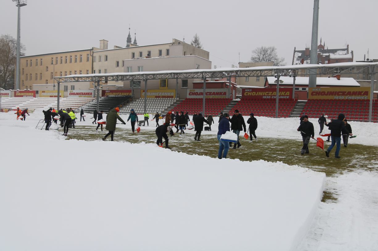 Co starci kibice Chojniczanki mogli sobie dziś (19.02) przypomnieć na czym polega czyn społeczny. Zryw żółto-biało-czerwonej społeczności spowodował, że spod grubej warstwy śniegu zaczęła się wyłaniać zielona murawa. Akcja odśnieżania boiska została zorganizowana po to, żeby Chojniczanka mogła skorzystać z przywileju rozegrania meczu ćwierćfinałowego Pucharu Polski z Cracovią Kraków u siebie. Ten zaplanowany jest na 3 marca. W akcji „odśnieżamy na Cracovię” brało udział około 100 osób jednocześnie, ale przez stadion przewinęło się o wiele więcej osób. Wśród uczestników byli prezesi klubu, trenerzy, zawodnicy, sponsorzy Chojniczanki czy zwykli kibice. Rozmawiał z nimi Wojciech Piepiorka.